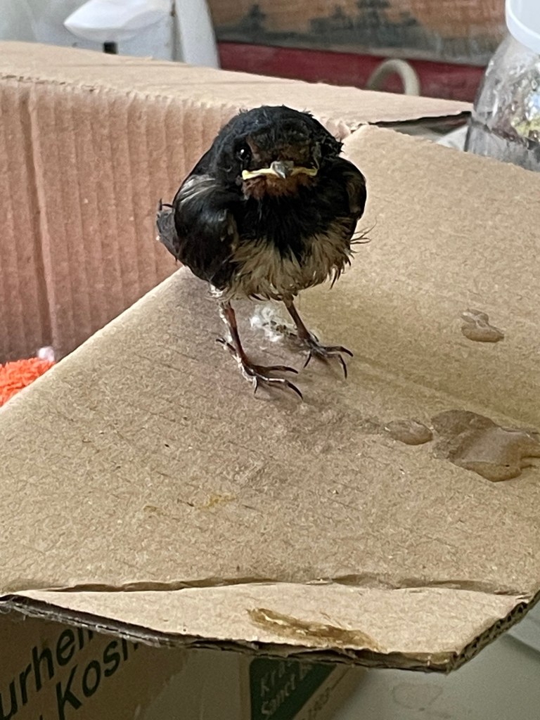 Once the little swallow was finally clean, I got a cardboard box and started researching what a young swallow actually eats. I already knew a little: if you find a weakened fledgling and have nothing else on hand, you can start by feeding it tiny balls of scrambled egg.